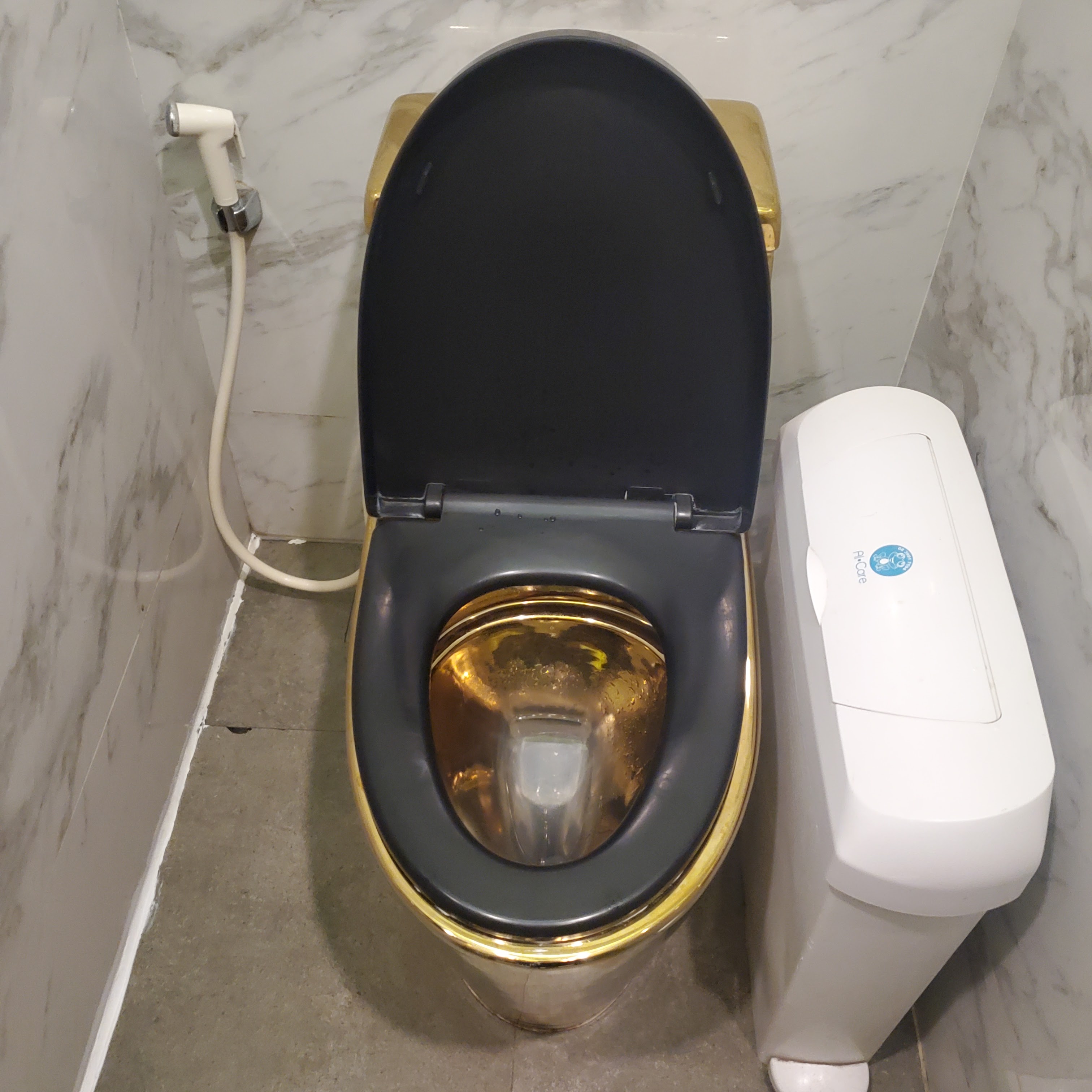 People are pretty nice, but everything is very shiny gold (including the toilets), it is huge, and all staff wear branded uniforms.