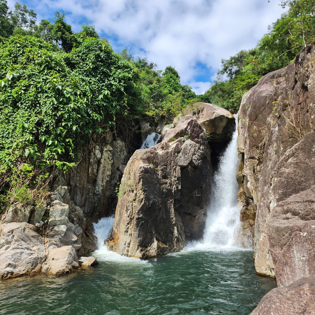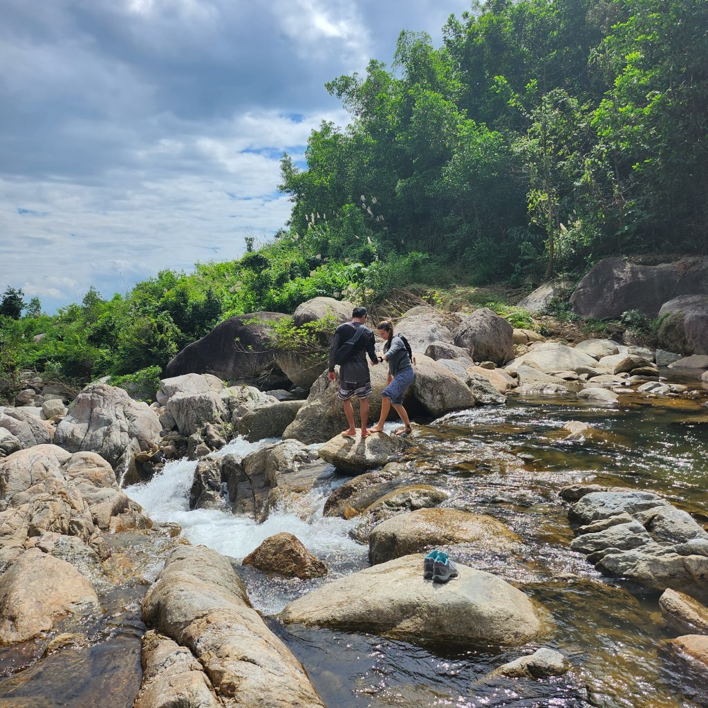 I still do not know what the Vietnamese name for these waterfalls, they kept referring to them as “Dominion”. We went with a guide who brought a machete for the last 1/4 of the “trail” to get to the falls. Please take a look at his footwear: too-small plastic slides.