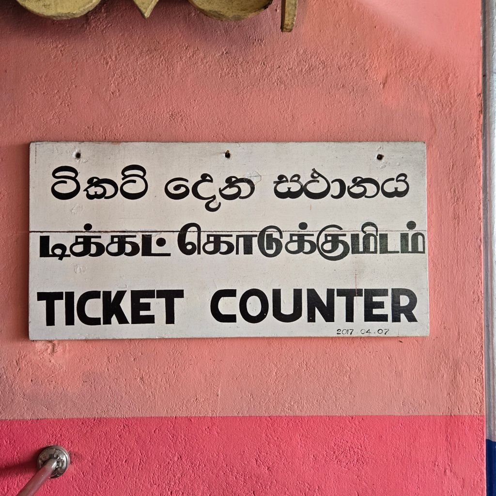 I love trains and I love visiting places that painstakingly care for their older train cars and keep rolling. The signmaker in me absolutely reveled in the handpainted signs at the stations. I think Sinhala and Tamal alphabets are gorgeous.